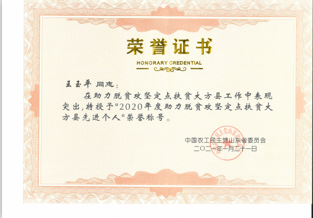 山東中天建華董事長王玉平作為中國農(nóng)工民主黨山東省委員會主要成員之一,與中國農(nóng)工民主黨山東省委員會一行人去了大方縣,并且在助力脫貧攻堅定點扶貧大方縣工作中表現(xiàn)突出,中國農(nóng)工民主黨山東省委員會特授予“2020年度助力脫貧攻堅定點扶貧大方縣先進(jìn)個人”。